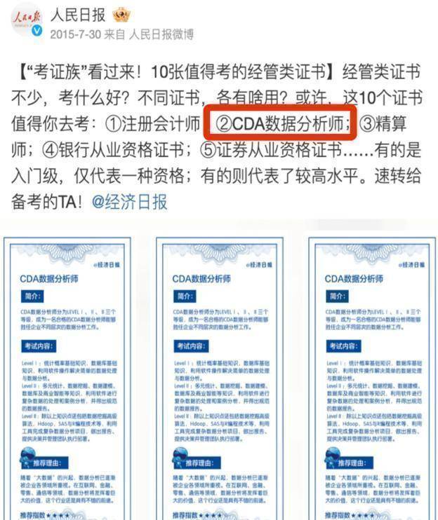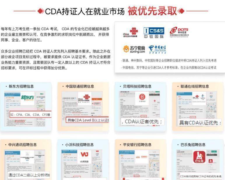 正在这个数字化的时代,中国联通、德勤、苏宁等出名企业都将CDA持证人列入优先考虑范畴,正在浩繁证书中,例如,
